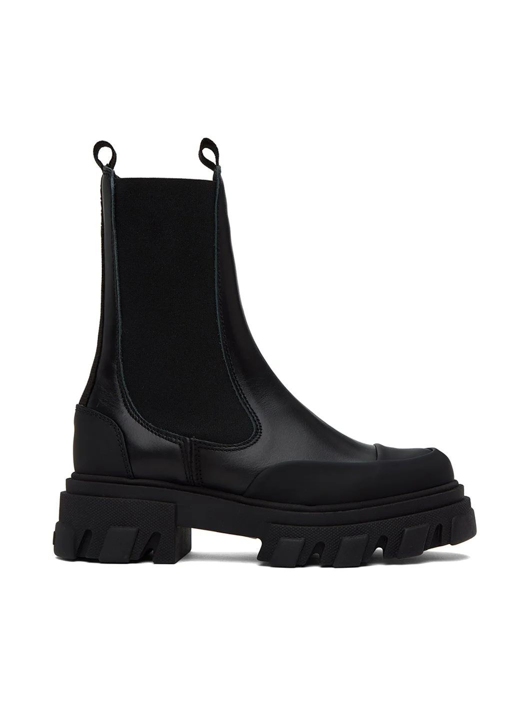 Calf-high buffed calfskin Chelsea boots in black. · Round rubber cap toe · Grosgrain pull-loops at collar · Elasticized gussets at sides · Rubberized logo bonded at heel tab · Logo embossed at heel counter · Textured rubber midsole · Treaded rubber outsole · Heel: H1.5 in Supplier color: Black