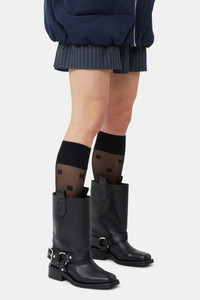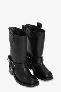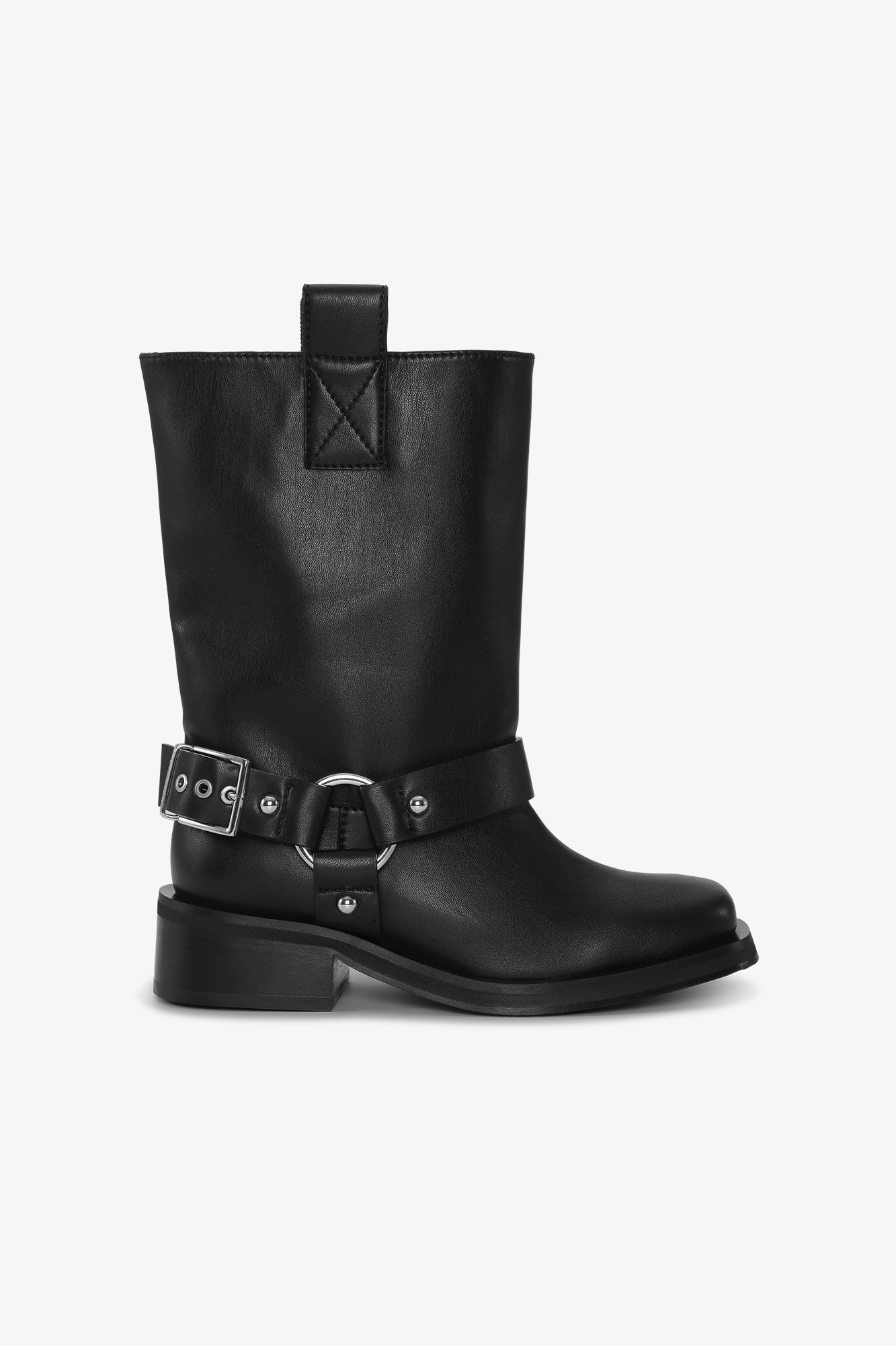 These Black Mid Shaft Biker Boots are designed with a tubular calf-length shaft and feature pull tabs, adjustable metal and buckle details and block heels. DETAILS - 45% recycled leather, 20% recycled poluester, 20% polyurethane, 15% polyester. Learn more about our materials - Lining composition: 50% Polyurethane 50% Polyester - Shaft: 25 - Sole height: 5 Made in: Portugal Product ID: S2275 SIZE & FIT - Fits true to size, take your normal size
