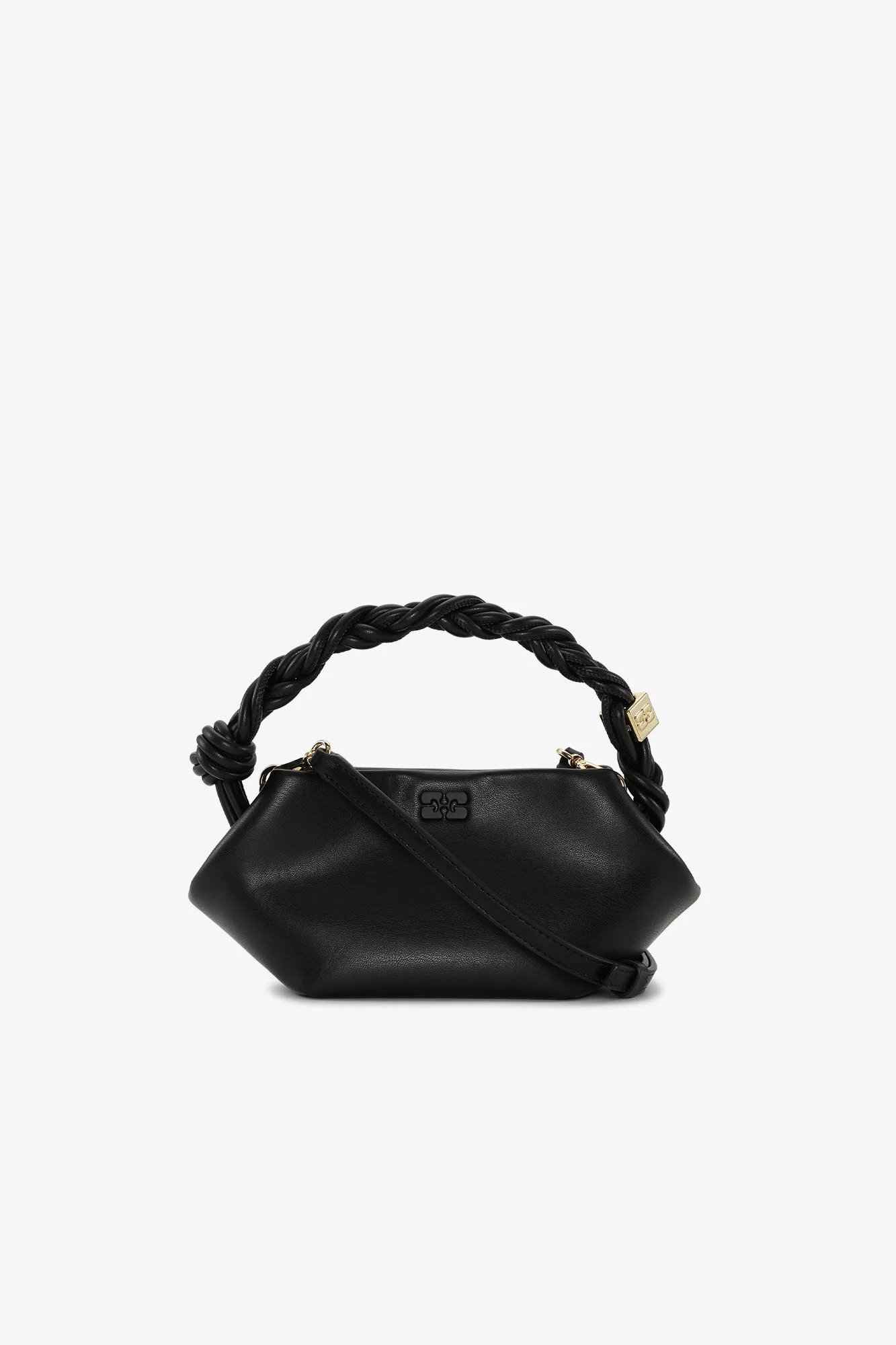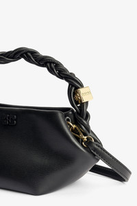 This Black Mini GANNI Bou Bag features a tone-on-tone metallic GANNI Butterfly logo, a twisted handle with a braided knot, and a gold-tone metallic dice with a GANNI Butterfly logo engraved. The bag has an internal magnetic closure, a flat card pocket inside, and an adjustable and removable shoulder strap for crossbody wear. DETAILS - 65% recycled leather, 19% polyurethane fibre, 16% polyester. Learn more about our materials - Lining composition: 65% Recycled Cotton 35% Cotton - Adjustable and removable shoulder strap - Tone-on-tone GANNI Butterfly logo - GANNI embossed logo on the back of the bag - Braided top handle with a braided knot - Metallic dice with a GANNI and Butterfly logo engraved - Internal magnet closure - One compartment - Flat card pocket inside Made in: China Product ID: A5379 SIZE & FIT - Strap length: 50 - Height: 11 - Width: 25 - Depth: 11.5
