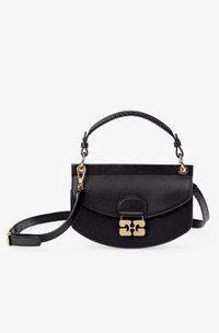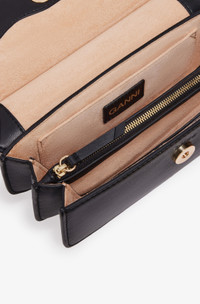 This Black Black Mini Top Handle Apo-G Bag features a magnetic closure with a GANNI Butterfly gold-tone clasp and a detachable strap and top handle, allowing for versatile wear as a shoulder bag or clutch. The compact interior has a slip pocket and three main compartments, one of which has a zip closure. DETAILS - 65% recycled leather, 19% polyurethane fibre, 16% polyester. Learn more about our materials - Adjustable and removable shoulder strap - GANNI Butterfly gold-tone clasp - Magnetic closure - Three main compartments, one equipped with a zip closure - Slip pocket Made in: China Product ID: A6349