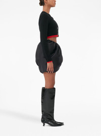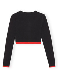 bed-detail merino wool-blend cardigan Spun from a plush blend of merino wool and cashmere, this cardigan from GANNI is cut to a cropped crew neck silhouette and elevated with a glistening beaded heart and contrasting stripe at the hem as a nod to the brand's whimsical ethos. Highlights - Black - Bright red - Merino wool-cashmere blend - Knitted construction - Crew neck - Front button fastening - Bead detailing - Contrasting trim - Long sleeves - Ribbed cuffs and hem Imported Composition Merino 70%, Cashmere 30%