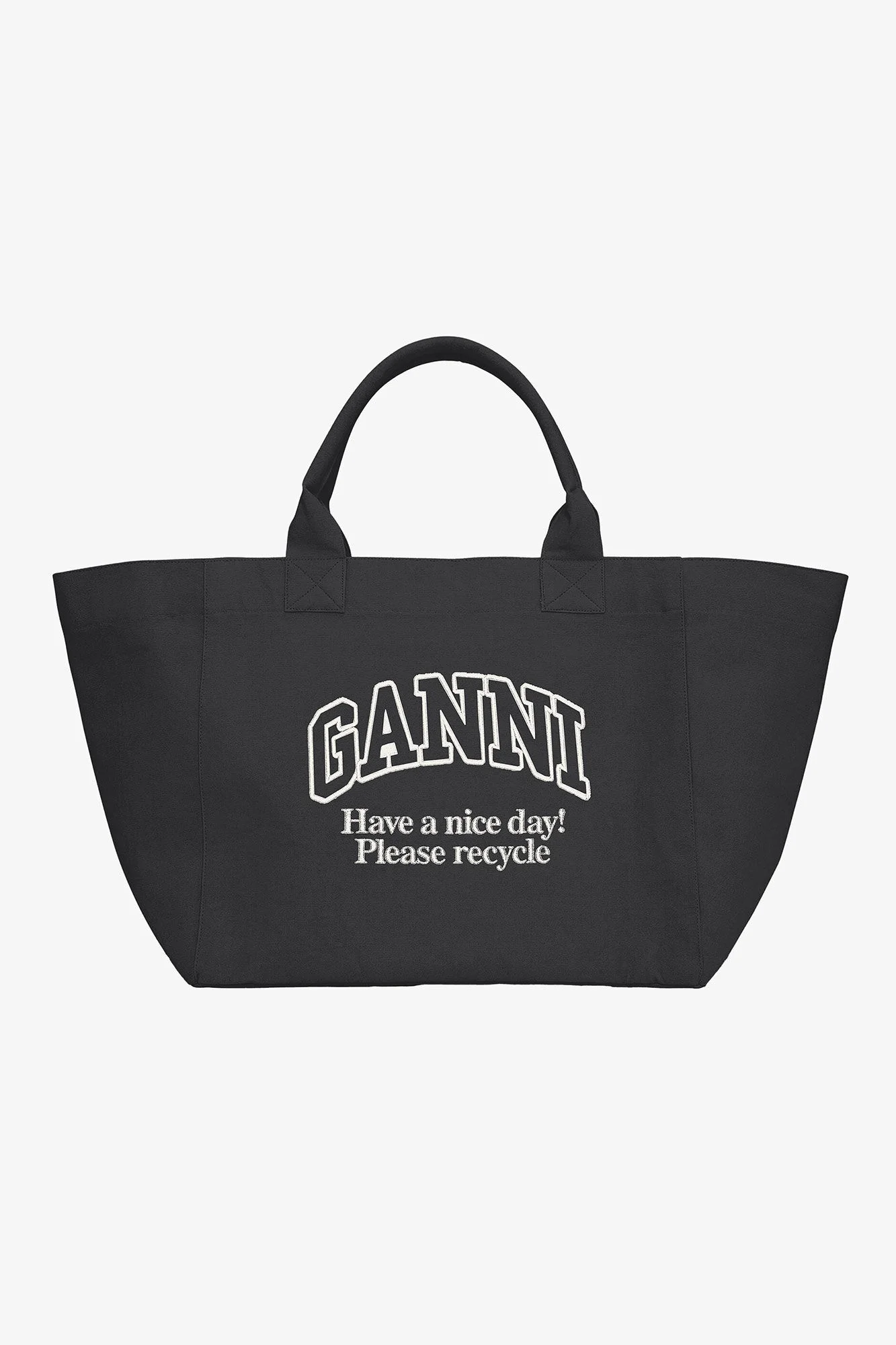 This Black Oversized Canvas Tote Bag features top handles, one large compartment, and a GANNI logo with the phrase 'Have a nice day! Please recycle' in white. DETAILS - 100% recycled cotton. Learn more about our materials - Top handle - One compartment - GANNI logo Made in: India Product ID: A6680