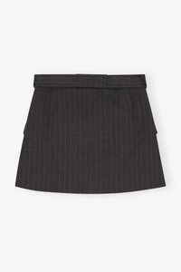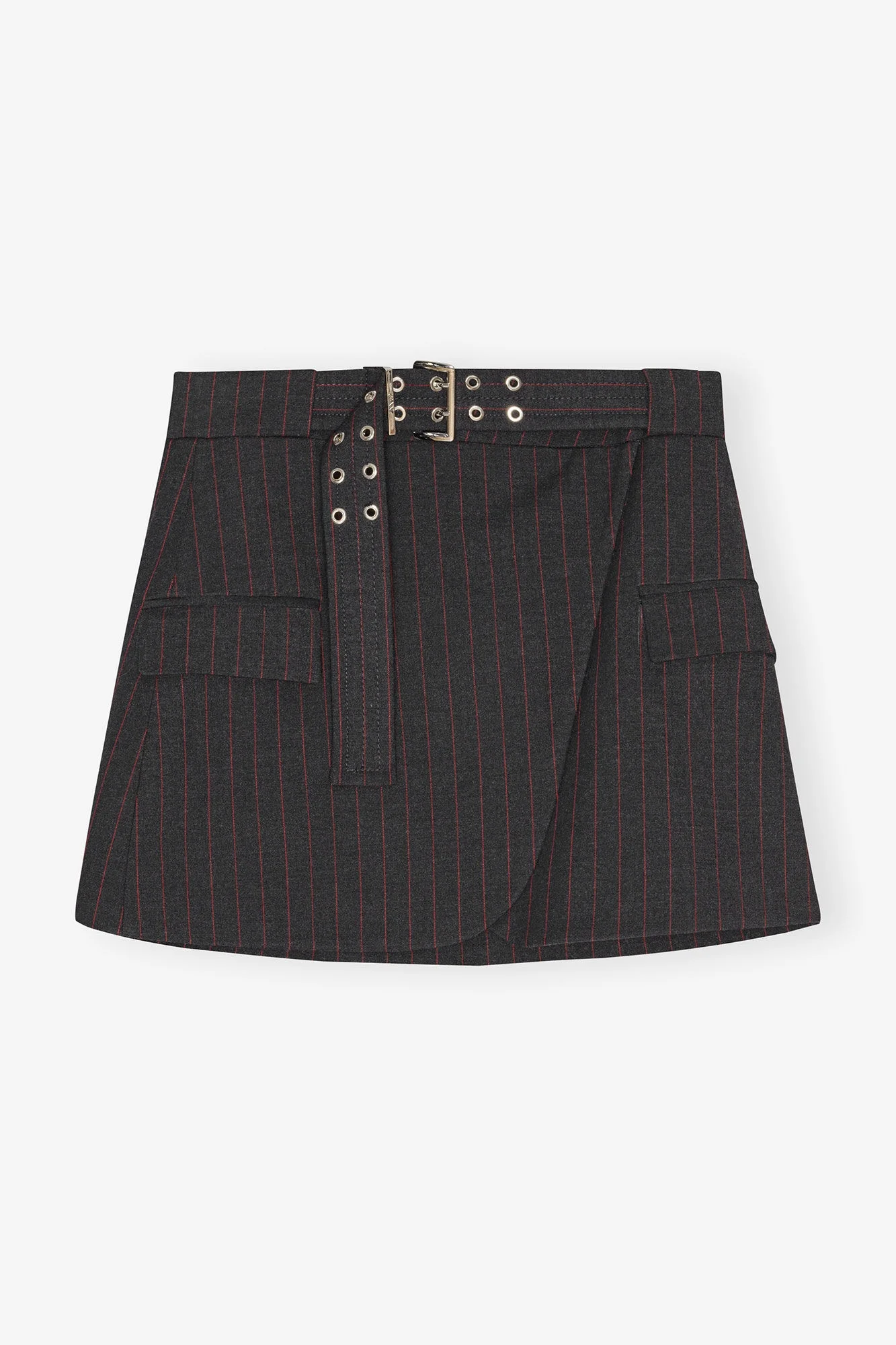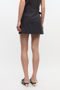 This skirt features a thin red pinstripe design, a matching belt with metallic eyelets and front pockets. DETAILS - 62% recycled polyester, 32% viscose, 6% elastane. Learn more about our materials - Lining composition: 100% Cotton - Structured silhouette - Red pinstripe - Metallic eyelet belt - Front pockets - Wrap-style front Made in: Turkey Product ID: W0711 SIZE & FIT - Regular fit - Mini length - Liva is 5’10” and wears a size US 4