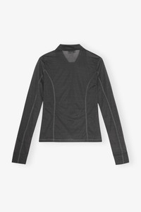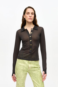 This Black Sheer Mesh Jersey Buttoned Collar Top features a collar, button closure at the front and long sleeves. DETAILS - 100% recycled polyester. Learn more about our materials - Collar - Long sleeves - Button closure at the front Made in: China Product ID: T4241 SIZE & FIT - Denise is 5’9” and wears a size US 4