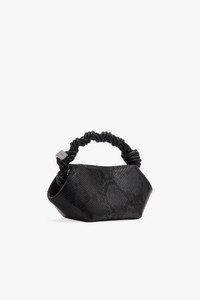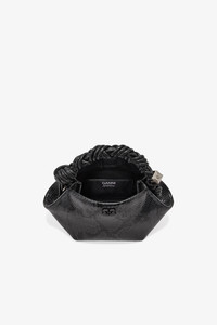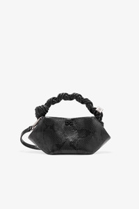 This bag features a tone-on-tone metallic GANNI Butterfly logo, a twisted handle with a braided knot, and a gold-tone metallic dice with a GANNI Butterfly logo engraved. The bag has an internal magnetic closure, a flat card pocket inside, and an adjustable and removable shoulder strap for crossbody wear. DETAILS - 58% recycled polyester, 42% polyurethane. Learn more about our materials - Lining composition: 65% Recycled Cotton 35% Cotton - Tone-on-tone GANNI Butterfly logo - GANNI embossed logo on the back of the bag - Braided top handle with a braided knot - Metallic dice with a GANNI and Butterfly logo engraved - Adjustable and removable shoulder strap - Internal magnet closure - One compartment Made in: China Product ID: A7071 SIZE & FIT - Strap length: 50 cm - Height: 11 cm - Width: 25 cm - Depth: 11.5 cm - Designed to hold an iPhone 15, cardholder, keys, lipstick - For personalised guidance on sizing and fit, contact our Customer Service team - here - .