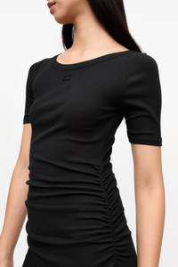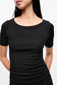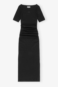 This dress features a round neckline and short sleeves, with ruching on the bodice. It is crafted from a soft cotton rib material and includes a GANNI Butterfly logo on the front. DETAILS - 95% organic cotton, 5% elastane. Learn more about our materials - Round neckline - Short sleeves - Ruching on the bodice - GANNI Butterfly logo - Round neckline - Short sleeves - Ruching detail on the bodice - GANNI Butterfly logo on the front Made in: Portugal Product ID: T4146 SIZE & FIT - Midi length - Slim fit - Cara is 5’9” and wears a size S