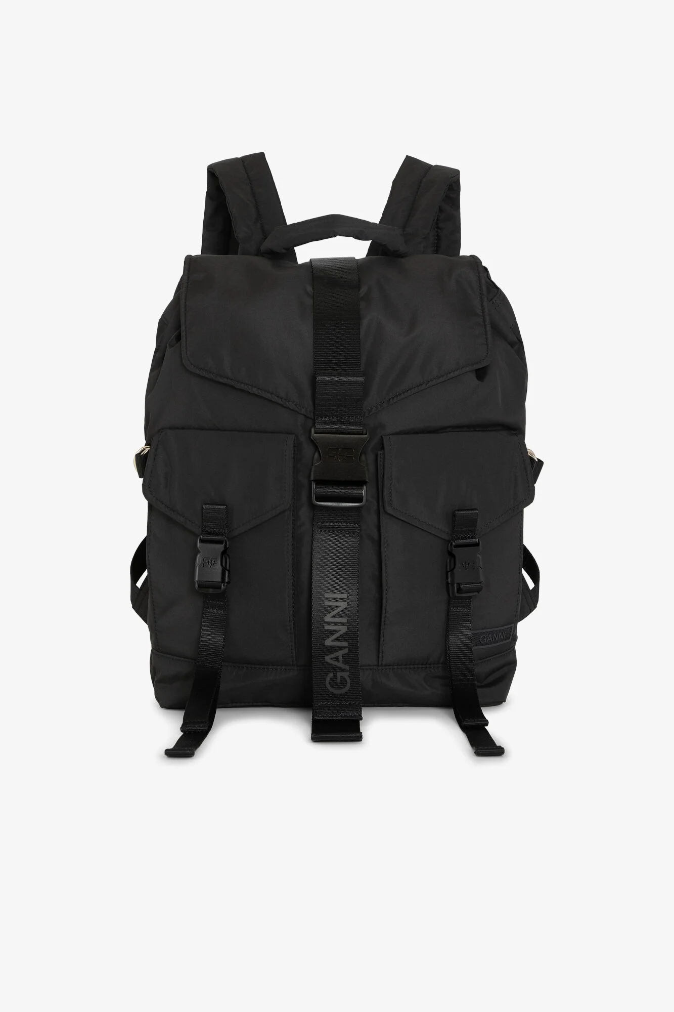 This Black Tech Backpack is made from certified recycled polyester. The backpack features adjustable and padded shoulder straps, a top handle, front buckle fastenings, front pockets, a foldover top and a GANNI logo. DETAILS - 100% recycled polyester. Learn more about our materials - Lining composition: 100% Recycled Polyester - Adjustable shoulder straps - Top handle - Front pockets - Front buckle fastenings - Foldover top Made in: China Product ID: A4755 SIZE & FIT - Strap length: 8 - Height: 39 - Width: 38 - Depth: 10