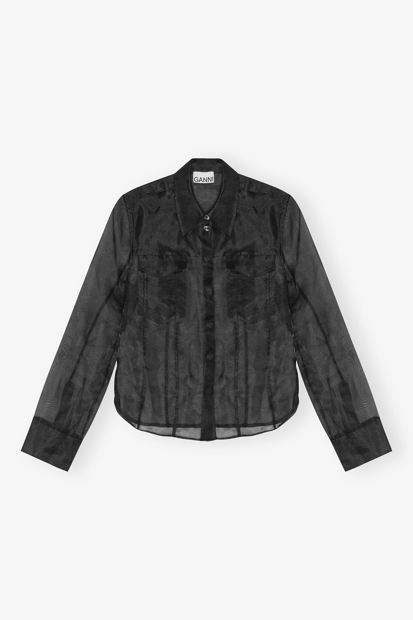 This Black Technical Organza Shirt features a collar, button closure, front pockets and long sleeves. DETAILS - 100% recycled polyester. Learn more about our materials - Collar - Long sleeves - Button closure - Front pockets Made in: China Product ID: W0551