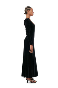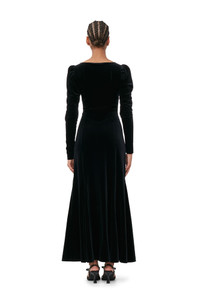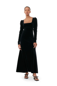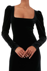 This Black Velvet Jersey Maxi Dress is made from recycled polyester and spandex. The dress is designed for a slim fit and features a square neckline, long puff sleeves and a zip closure. DETAILS - 94% recycled polyester, 6% spandex. Learn more about our materials - Square neckline - Long puff sleeves - Zip closure Made in: China Product ID: T3701 SIZE & FIT - Designed for a slim fit throughout, skimming the body without clinging - Fits true to size, take your normal size - Mediumweight, soft fabric - Patricia is 5’8” and wears a size US 4