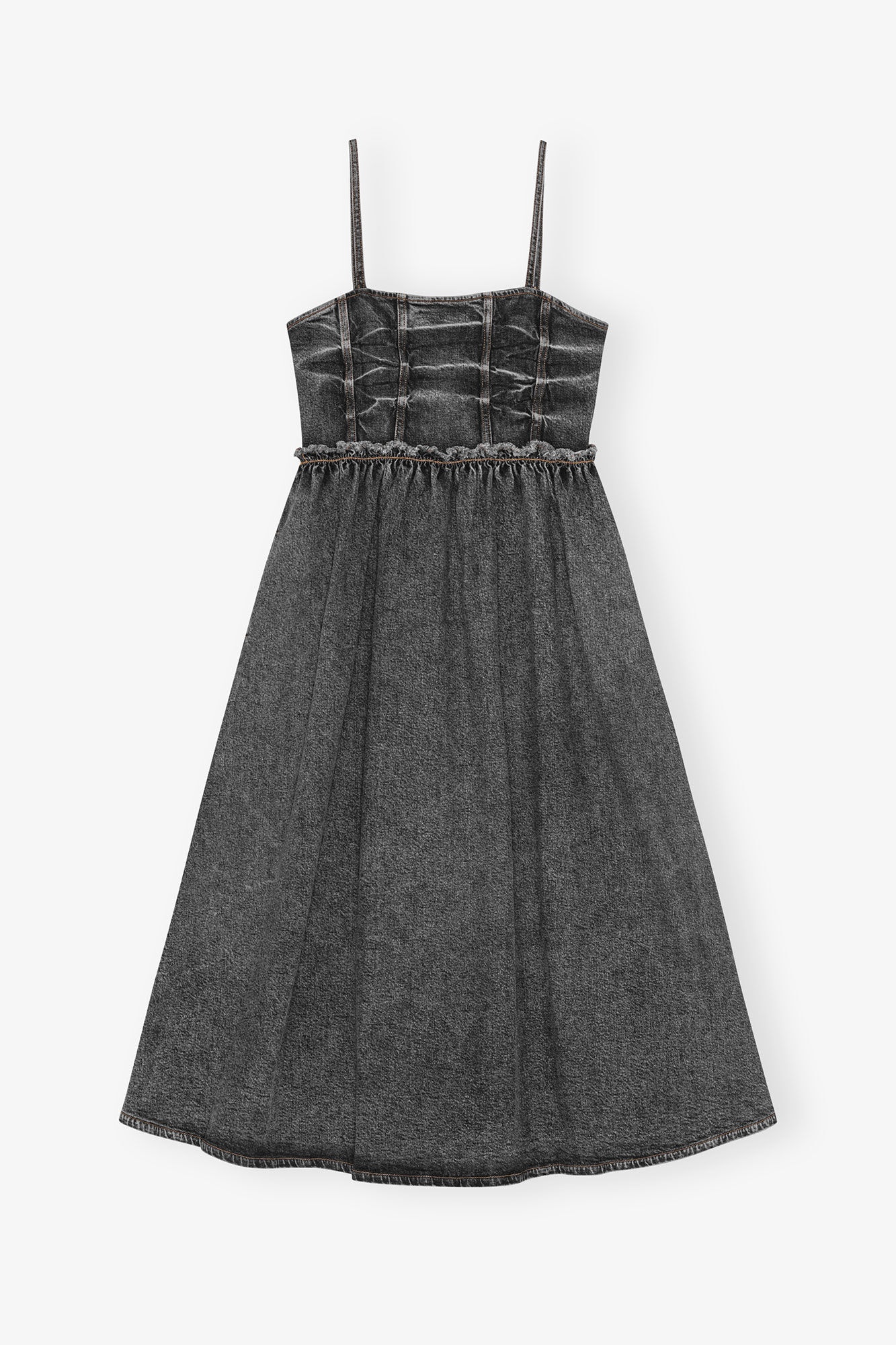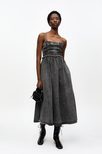 Revealed on the Spring/Summer 2025 runway This Black Washed Stretch Future Denim Dress features thin straps, a straight neckline, ruffle detailing and a flared skirt. DETAILS - 59% organic cotton, 40% viscose, 1% elastane. Learn more about our materials - Straight neckline - Thin straps - Ruffle detailing - Flared skirt Made in: Tunisia Product ID: J1690 SIZE & FIT - Zayna is 5’10” and wears a size US 4