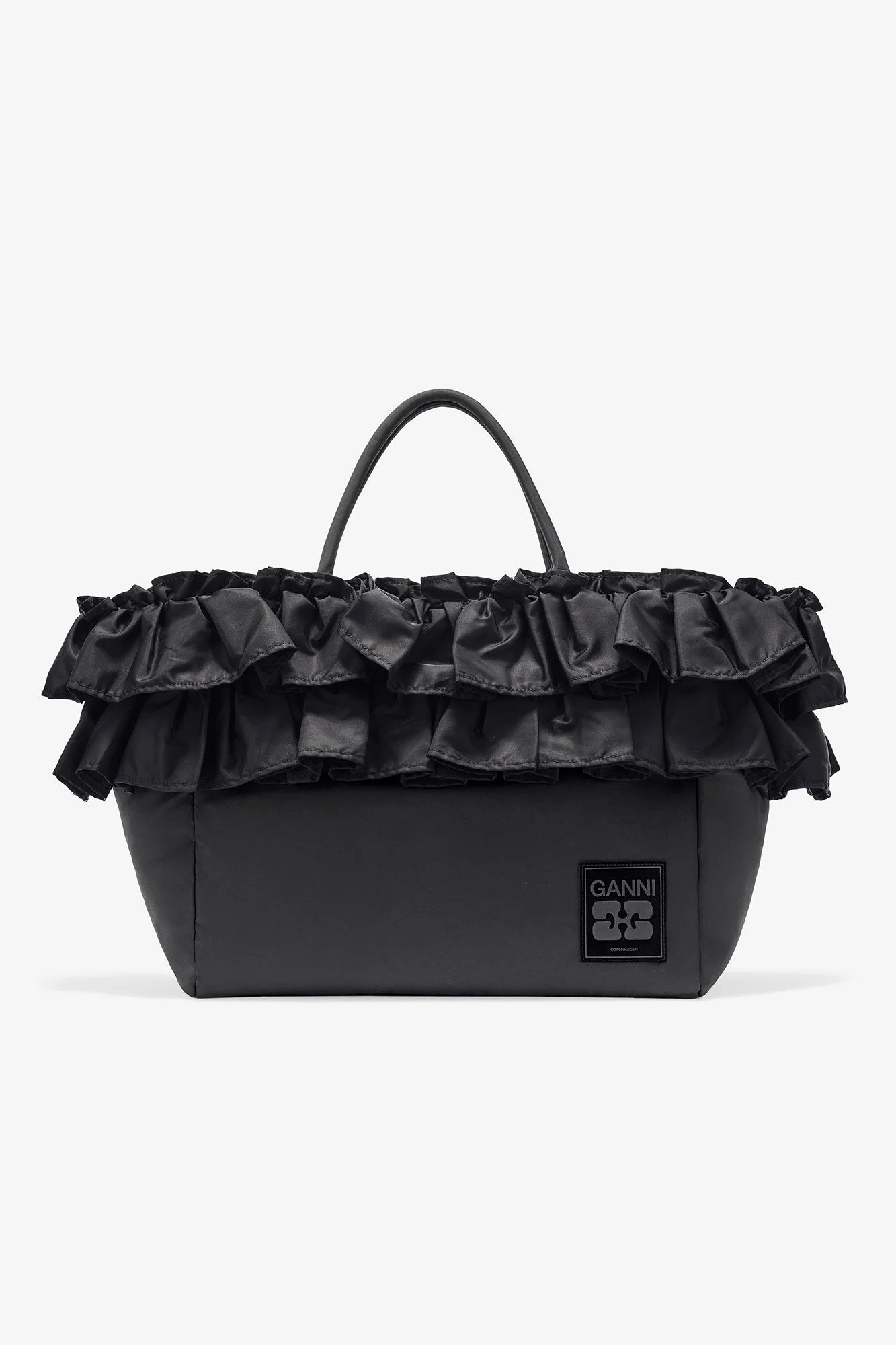 This tote bag features top handles, one large compartment, a GANNI logo and ruffle detailing. DETAILS - 100% recycled nylon. Learn more about our materials - Top handles - One compartment - GANNI logo - Ruffle detailing - Inner zipped pocket Made in: China Product ID: A7188 SIZE & FIT - Strap length: 18 cm - Height: 64 cm - Width: 33.5 cm - Depth: 8 cm - Designed to hold an iPhone 16 Pro Max, wallet, sunglasses, keys, water bottle, pouch, gym clothes, 15” laptop - For personalised guidance on sizing and fit, contact our Customer Service team - here - .