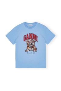 This Blue Basic Jersey Tiger Relaxed T-shirt features a round neckline, short sleeves and a graphic GANNI print. DETAILS - 100% organic cotton - Round neckline - Short sleeves Made in: Portugal Product ID: T4007 SIZE & FIT - Designed for a relaxed fit. Close fit over the shoulders - Take your normal size to achieve the model's look, those in between sizes or with a smaller frame might consider taking a size down for a closer fit - Ariunzul is 5’9” and wears a size S