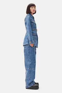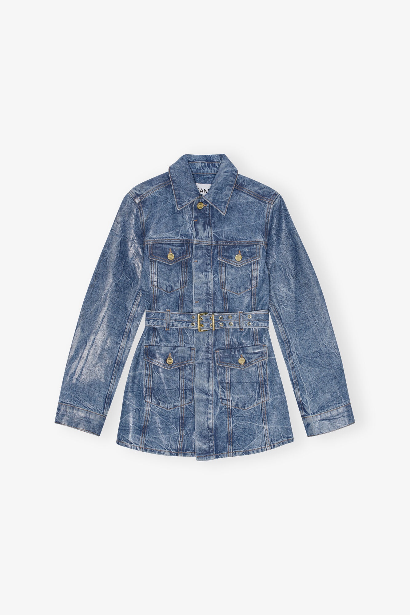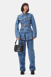 This Blue Foil Denim Jacket features a collar and an adjustable belt with a gold-tone buckle and matching eyelets. The jacket has two flap pockets on the chest and two on the hips. DETAILS - 100% organic cotton. Learn more about our materials Made in: Turkey Product ID: J1540 SIZE & FIT - Designed for a regular fit - Ariunzul is 5’9” and wears a size US 4