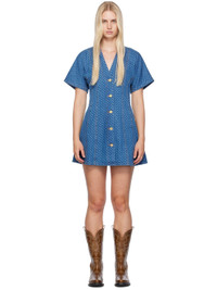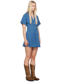 Non-stretch organic cotton denim dress. Jacquard polka dot pattern throughout. · V-neck · Button closure · Seam pockets · Flared hem · Unlined Supplier color: Mid blue stone