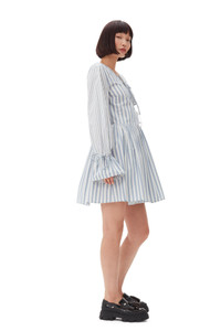 This Blue Stripe Cotton Mini Wrap Dress features a v-neckline, long sleeves with tie band detailing, and a tie band closure at the front. DETAILS - 100% organic cotton. Learn more about our materials - V-neckline - Long sleeves with tie band detailing - Ties at the front Made in: India Product ID: F9597 SIZE & FIT - Designed for a relaxed fit with a cinched elasticated waistband, slightly defined waist - Take your normal size to achieve the model's look, those in between sizes or with a smaller frame might consider taking a size down for a closer fit - Ariunzul is 5’9” and wears a size US 4