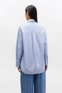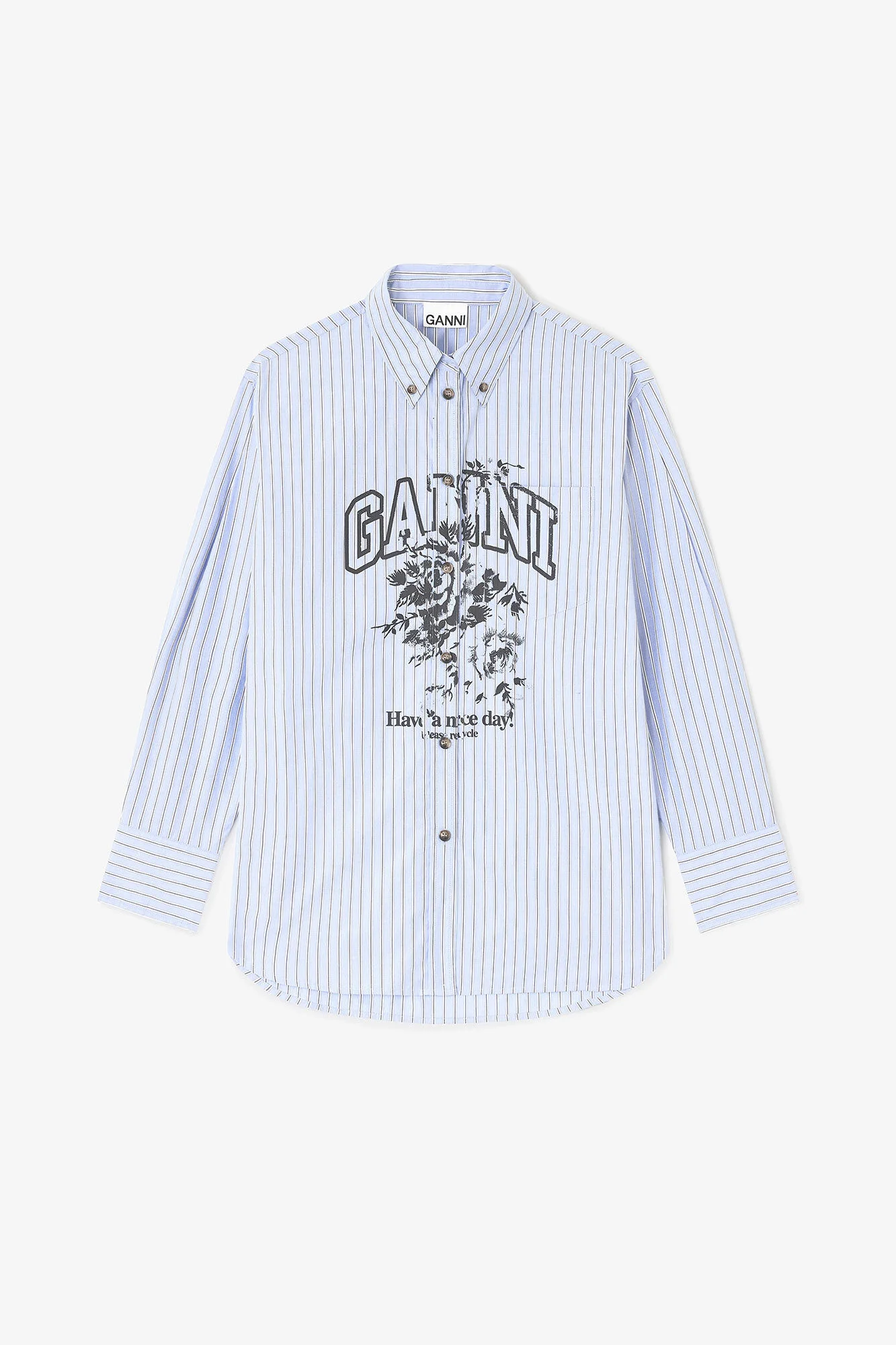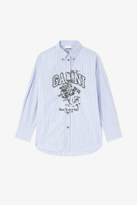 This shirt features a classic collar, button-front closure, a chest pocket and a GANNI logo. DETAILS - 100% organic cotton. Learn more about our materials - Stripe print - Classic collar - Button-front closure - Chest pocket - Long sleeves - Cuffs - GANNI logo - 'Have a nice day! Please recycle' message Made in: India Product ID: W0826 SIZE & FIT - Regular fit - Lisa Lu is 5’10” and wears a size US 4 - For personalised guidance on sizing and fit, contact our Customer Service team - here - .