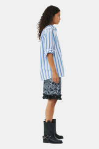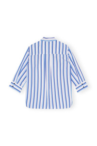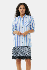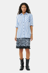 This Blue Striped Cotton Oversized Shirt is designed for an oversized fit and features a collar, button closure, chest pocket, embroidered GANNI logo, curved side seams, striped print and long sleeves with buttoned cuffs. DETAILS - 100% organic cotton. Learn more about our materials - Collar - Button closure - Chest pocket - Embroidered GANNI logo - Curved side seams - Striped print - Long sleeves with buttoned cuffs Made in: India Product ID: F9153 SIZE & FIT - Designed for a loose oversized fit - Take your normal size to achieve the model's look, consider sizing down for a less oversized fit - Lightweight, soft fabric - Julie is 5’11” and wears a size US 4