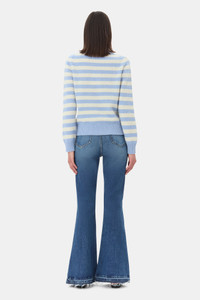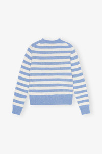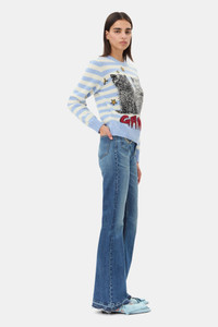 This Blue Striped Graphic Cat Sweater features blue and white horizontal stripes with a black-and-white cat motif on the front, with gold star details and a red GANNI logo. The sweater has a crew neckline, long sleeves, and ribbed cuffs and hem. DETAILS - 44% wool, 34% recycled wool, 19% recycled polyamide, 2% polyester, 1% polyamide. Learn more about our materials - Round neckline - Long sleeves - Ribbed edges Made in: Romania Product ID: K2369 SIZE & FIT - Regular fit - Paulina is 5’10” and wears a size S