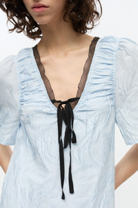 This Blue Textured Cloque Midi Dress features a v-neckline with a tie detail, short sleeves and a dropped waist. DETAILS - 52% recycled polyester, 30% polyester, 18% nylon. Learn more about our materials - Lining: 100% recycled polyester - V-neckline with tie detail - Short sleeves - Dropped waist Made in: China Product ID: W0467 SIZE & FIT - Mariana is 5’10” and wears a size US 4
