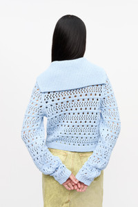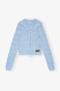 This Blue Tie String Cardigan features a large collar, three tie bands at the front and a sewn-on GANNI logo patch. DETAILS - 50% recycled cotton, 50% recycled polyester. Learn more about our materials - Large collar - Three tie bands at the front - Sewn-on GANNI logo patch Made in: Moldova Product ID: K2429 SIZE & FIT - Cara is 5’9” and wears a size S