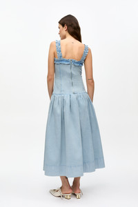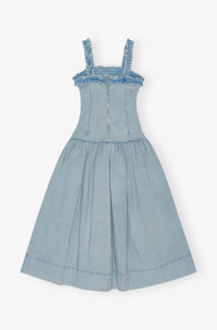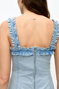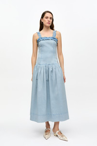 This Blue Washed Stretch Cotton Corset Dress features a straight neckline, two straps with ruffle details, zip closure at the back, a dropped waist and flared skirt. DETAILS - 97% cotton, 3% elastane. Learn more about our materials - Straight neckline - Two straps - Zip closure at the back - Dropped waist - Ruffle detail - Flared skirt Made in: India Product ID: W0639 SIZE & FIT - Denise is 5’9” and wears a size US 4