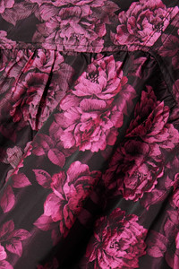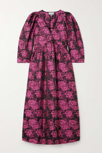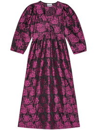 EDITORS'NOTES GANNI's midi dress is patterned with an array of bold blooms – gaze closer and you'll notice the label's logo dappled throughout. It’s made from lustrous jacquard blended with 50% recycled fibers and has a V-neckline. This product Reduces Waste. Find out more about NET SUSTAIN here. SIZE & FIT - EU 32 = UK4/ US 0/ FR 34/ IT 38 - EU 34 = UK 6/ US 2/ FR 36/ IT 40 - EU 36 = UK 8/ US 4/ FR 38/ IT 42 - EU 38 = UK 10/ US 6/ FR 40/ IT 44 - EU 40 = UK 12/ US 8/ FR 42/ IT 46 - EU 42 = UK 14/ US 10/ FR 44/ IT 48 - EU 44 = UK 16/ US 12/ FR 46/ IT 50 - Fits true to size, take your normal size - Designed to be slightly fitted at the bust and waist, loose at the hip - Mid-weight, non-stretchy fabric - Model is 177cm/ 5'10" and is wearing an EU 36 DETAILS & CARE - Tonal-pink and black jacquard - Concealed zip fastening along side - 50% recycled polyester, 50% polyester - Designer color: Cone Flower