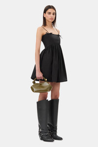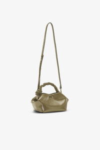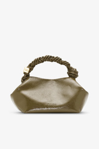 This Olive Green Patent Small GANNI Bou Bag features a tone-on-tone metallic GANNI Butterfly logo, a twisted handle with a braided knot, and a gold-tone metallic dice with a GANNI Butterfly logo engraved. The bag has an internal magnetic closure, a flat card pocket inside, and an adjustable and removable shoulder strap for crossbody wear. DETAILS - 52% recycled leather, 27% polyester, 21% polyurethane fibre. Learn more about our materials - Lining composition: 65% Recycled Cotton 35% Cotton - Adjustable and removable shoulder strap - Tone-on-tone GANNI Butterfly logo - GANNI embossed logo on the back of the bag - Braided top handle with a braided knot - Metallic dice with a GANNI and Butterfly logo engraved - Internal magnet closure - Two compartments - Flat card pocket inside Made in: China Product ID: A6337 SIZE & FIT - Strap length: 50 - Height: 14 - Width: 28 - Depth: 17