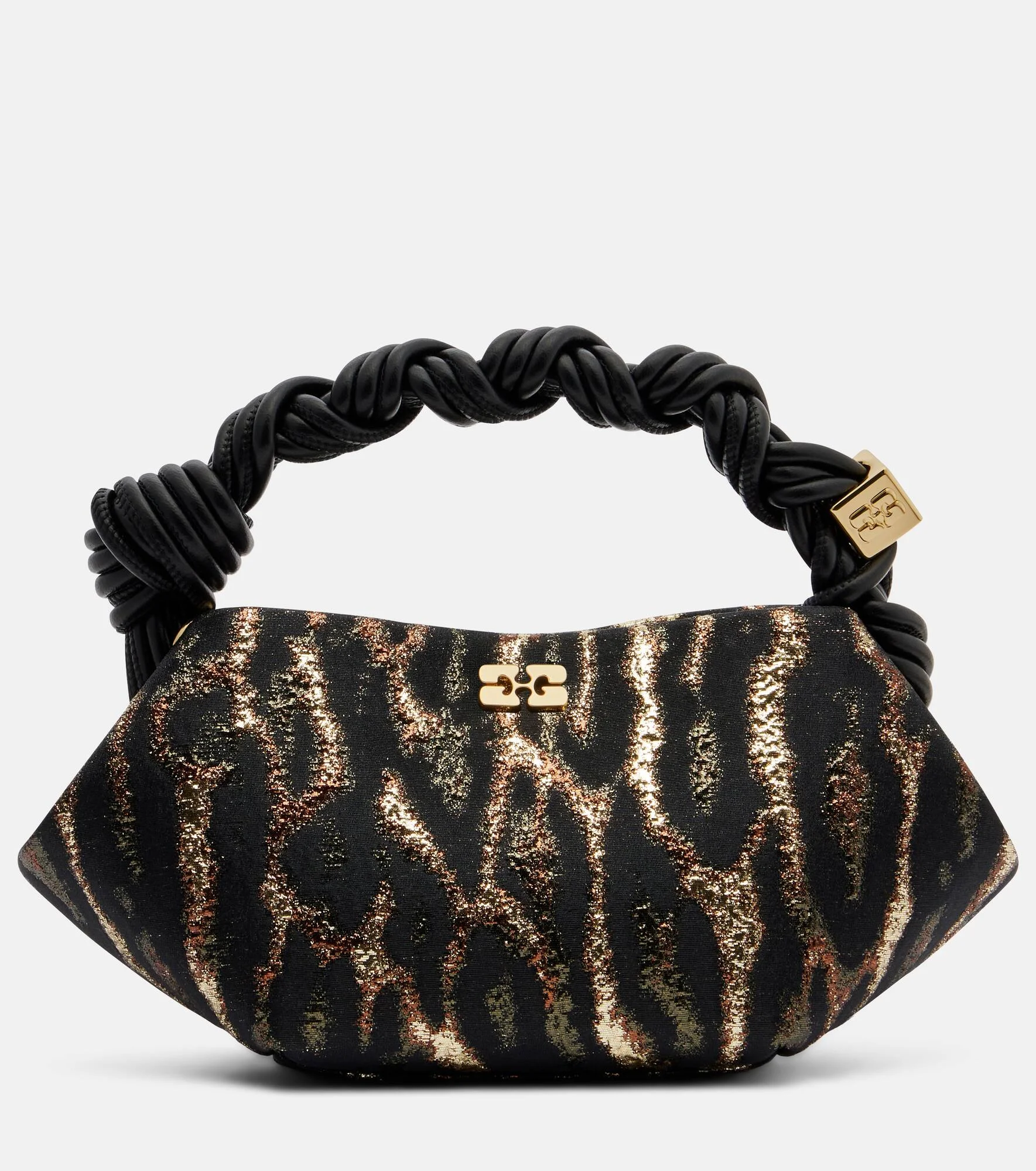 Copenhagen-based brand Ganni reshapes the meaning of Scandinavian style with its whimsy and playful approach to design. The Bou Mini top-handle bag is constructed from leopard-printed cloque. Product Details - Material: fabric - Lining: fabric - Made in China - Color: black - Designer color name: Antique Bronze - Item color: black, gold - Top handle, Detachable shoulder strap - Closure: magnetic fastening - Trim: leather - Hardware color: gold - Item number: P01135239 Size & Fit - Height 11,5cm-4.5" - Min. width 12cm-4.5" - Max. width 25cm-10" - Depth 11cm-4.5" - Length of handle 25cm-10" - Adjustable shoulder strap - Min. length shoulder strap 104cm-41" - Max. length shoulder strap 118cm-46.5"