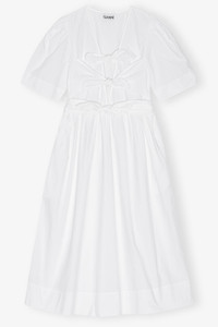 This White Stretch Cotton Tie Strap Midi Dress features a deep v-neckline with three tie bands at the front, belt loops, short and puffed sleeves, side pockets and a flared skirt. DETAILS - 97% cotton, 3% elastane. Learn more about our materials - Deep V-neckline - Short, puffed sleeves - Three tie bands at the front - Side pockets - Belt loops - Flared skirt Made in: India Product ID: W0306 SIZE & FIT - Xia is 5’9” and wears a size US 4