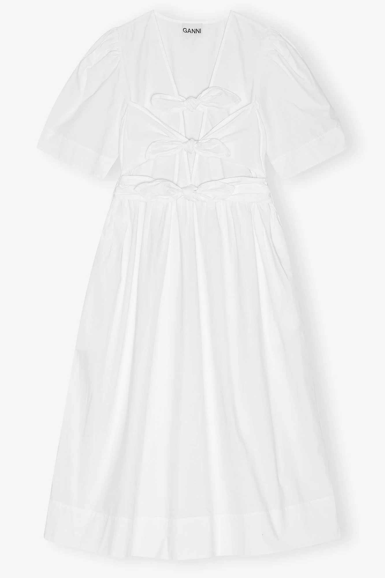 WHITE STRETCH COTTON TIE STRAP MIDI DRESS