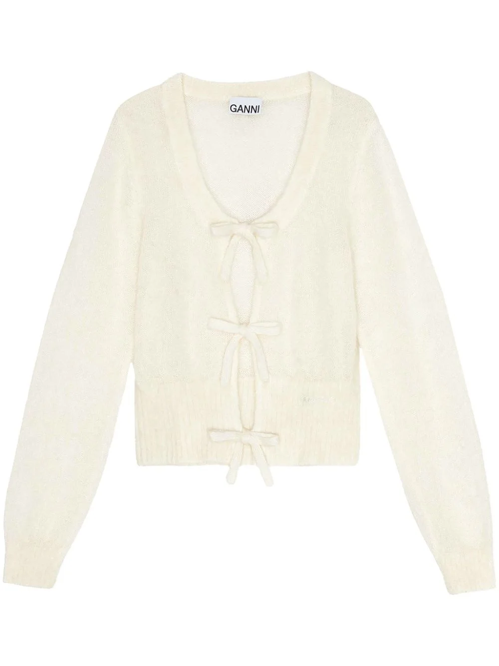 bow detailing long sleeve cardigan Highlights - Beige - Ribbed knit - Bow detailing - Scoop neck - Long sleeves - Ribbed cuffs and hem Imported Composition Mohair 55%, Recycled Polyamide 29%, Merino 16%
