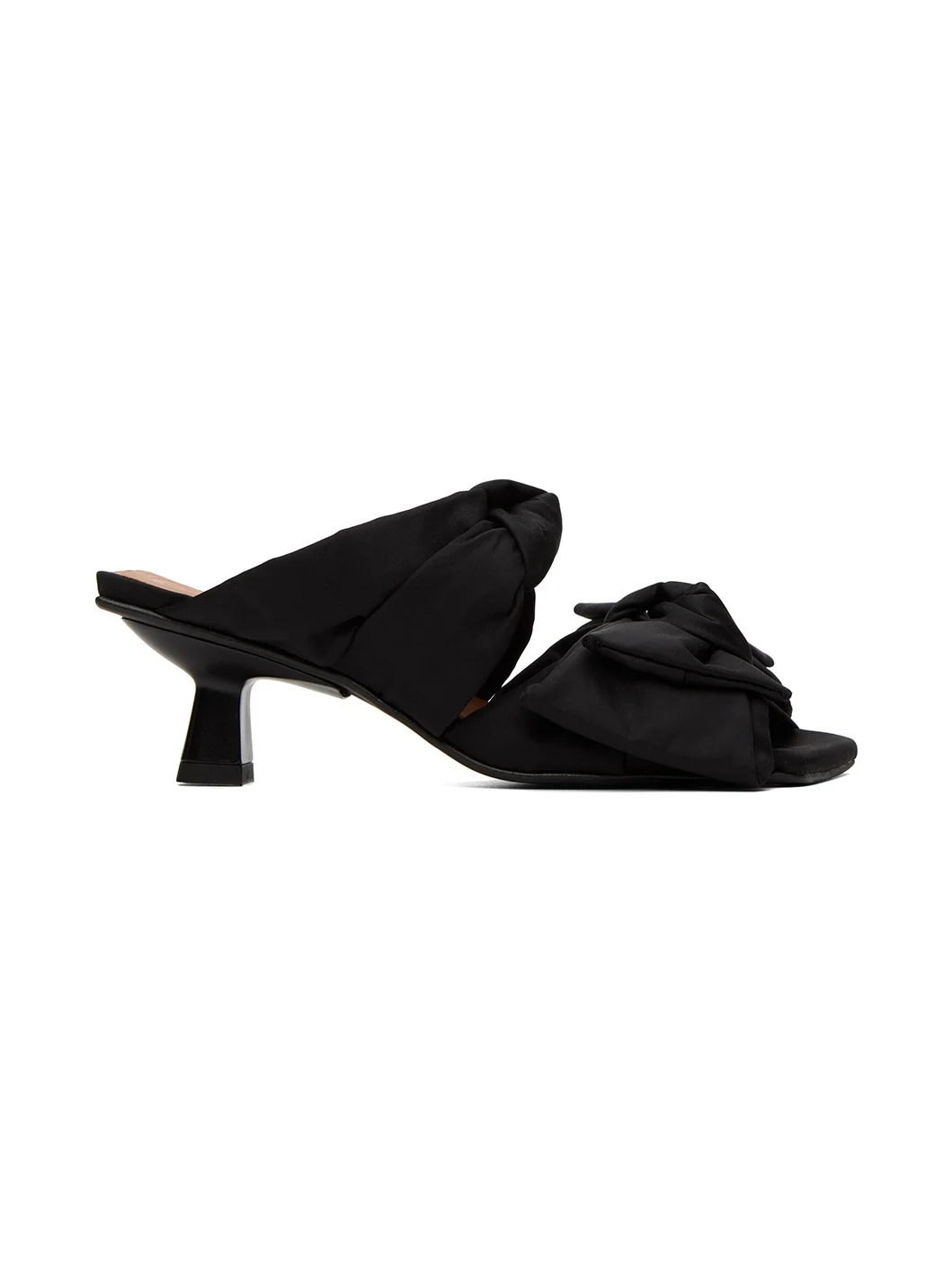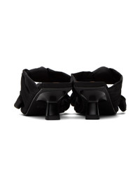 Recycled nylon twill heeled sandals in black. · Open square toe · Strap with bow detailing at vamp · Logo embossed buffed leather footbed · Rubber injection at kitten heel · Rubber sole · Heel: H2.75 Supplier color: Black Upper: textile. Sole: rubber. Made in Spain 231144F122005
