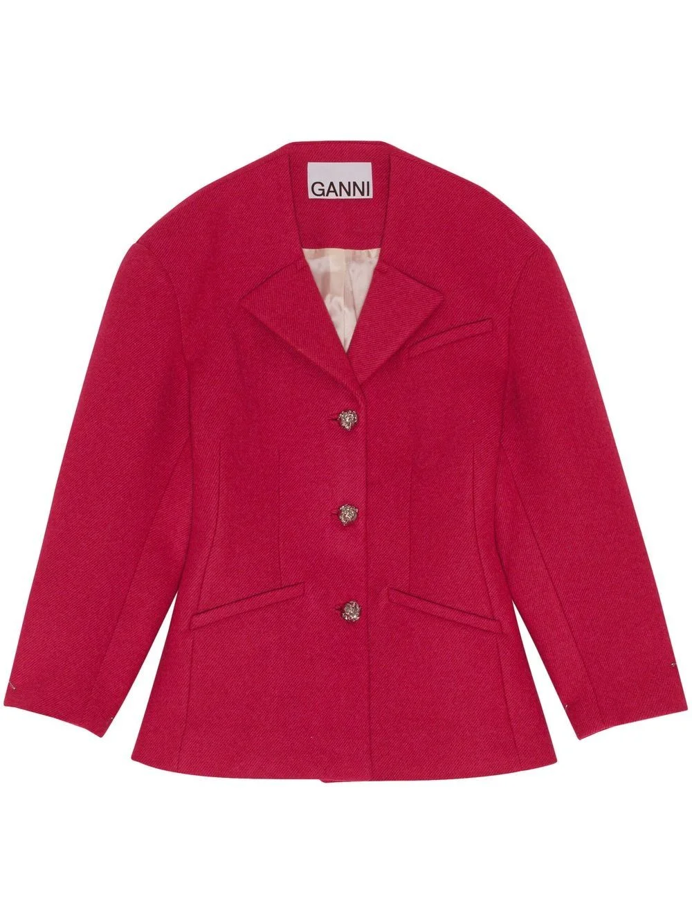 broad-shoulder single-breasted jacket hot pink recycled wool blend wide notch lapels long sleeves front button fastening Conscious: This item is made from at least 50% recycled or upcycled materials. For recycled synthetic clothing products we highly recommend using a microfibre-catching washing bag to ensure that no microplastics that can pollute water are released in the process. Imported Composition Recycled Wool 70%, Polyamide 30% Washing instructions Dry Clean Only