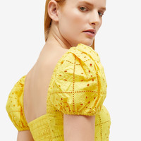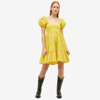 Effortless Scandi cool meets 16th century textile techniques with this Broderie Anglaise dress by Copenhagen-based Ganni. Playful and fun, this mini dress features puffed sleeves and a smocked bodice with a square neck and a low back for a cottage core inspired silhouette. Wear it with cowboy boots to picnics in the park this summer. - 100% Organic Cotton - Square Neckline - Zip Closure - Elasticated Puff Sleeves - Made in India