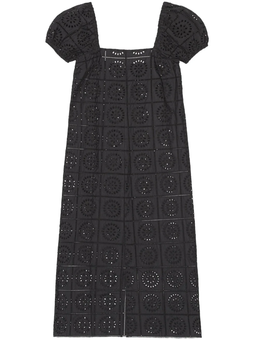 broderie anglaise midi dress Channelling a laidback yet refined aesthetic, GANNI presents this midi dress in an understated black hue. The piece is defined by its broderie anglaise construction that creates an airy feel while the square-neck, short-sleeved silhouette lends a classic appeal. Highlights - Black - Organic cotton - Broderie anglaise - Square neck - Short sleeves - Calf-length - Straight hem Imported Composition Organic Cotton 100% SIZE & FIT FittingInformation Designed to be unstructured, offering a loose fit throughout The elasticated shoulders offer movement and a comfortable fit Made from a midweight non-stretch fabric This piece fits true to size – take your usual size Washing instructions Read Manufacturer Guidelines