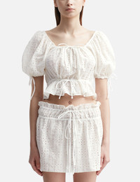 - Ganni - White Broderie Anglaise Cropped Top - Regular fit - Square neckline with drawstring - Adjustable drawstring at waist and cuffs - Low-back details - Short sleeves - Cropped hem - Sheer design - Unlined - Color: Bright White - Material: 100% Cotton - See more Tops and Clothing SIZING - Model wears size 34 - Model measures: Height 176cm, Chest 32”/81cm, Waist 23”/59cm,Hip 35”/90cm
