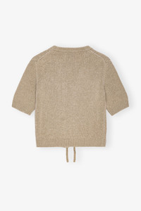 This Brown Future Wool Mix Short Sleeve Cardigan features a deep v-neckline, ties at the front, elbow-length sleeves, ribbed edges and a sewn-on GANNI logo patch. The knit contains Viscose made with CIRCULOSE®, a next-gen material that is part of our Fabrics of the Future initiative. Learn more in our Material Index. DETAILS - 60% recycled wool, 40% viscose. Learn more about our materials - Deep V-neckline - Elbow-length sleeves - Ties at the front - Ribbed edges - Sewn-on GANNI logo patch Made in: Romania Product ID: K2432 SIZE & FIT - Jenny is 5’10” and wears a size S