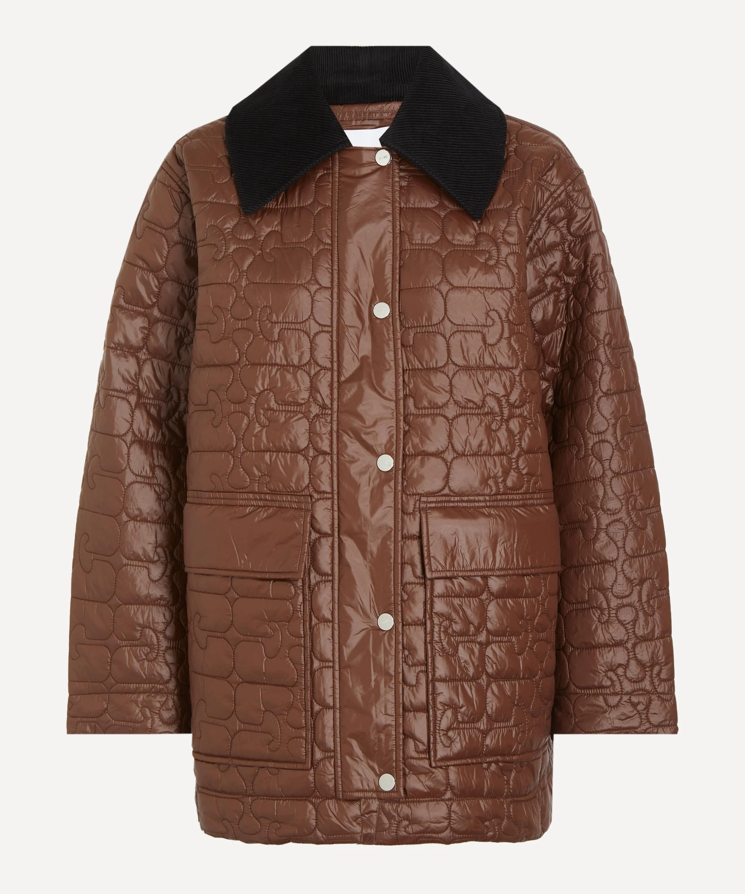 DETAILS Quilted jacket Relaxed fit Midi length Lightly padded GANNI logo quilting Corduroy collar Dual zip and snap closure Two front pockets SIZE & FIT Model is 176cm/5'9.5"; Chest: 78cm; Waist: 62cm; Hip: 91cm and wears a size S-M COMPOSITION & CARE 100% Nylon Dry clean