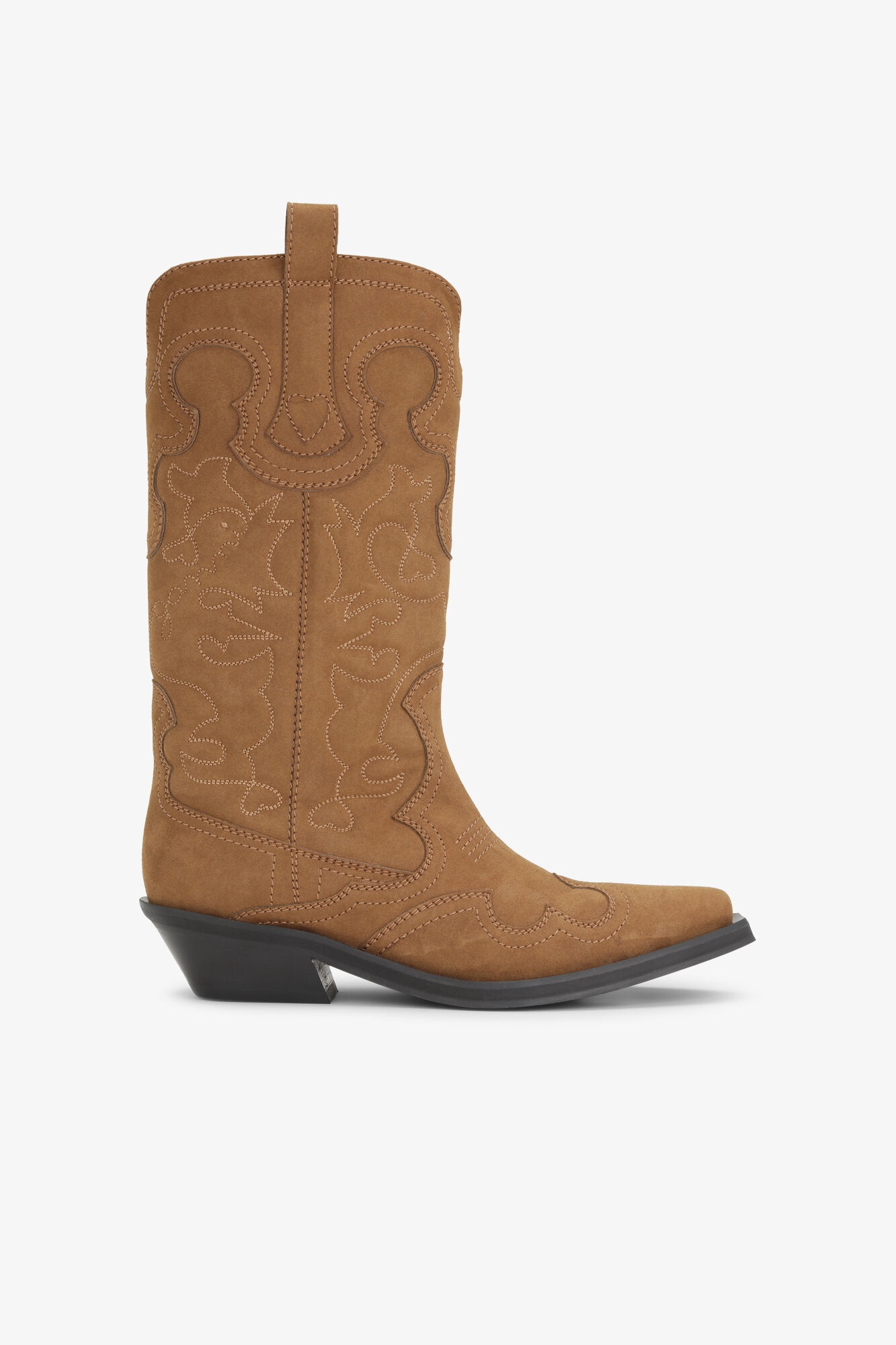 These Brown Suede Mid Shaft Embroidered Western Boots feature a pointed toe and embroidered detailing. The shoes have a low, angled heel and pull tabs. DETAILS - 56% recycled polyamide, 44% polyurethane. Learn more about our materials - Mid-calf boots - Pointed toe - Embroidered detailing - Pull tabs - Low, angled heel Made in: Portugal Product ID: S2742 SIZE & FIT - Fits true to size, take your normal size