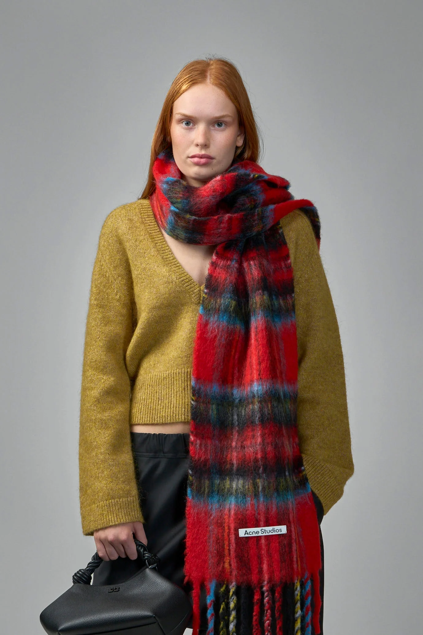 V-neck pullover in a mossy yellow tone, knitted from a fuzzy textured yarn. It features long sleeves, ribbed hem and cuffs, and a cropped silhouette. Materials: 100% Wool Color: custard SKU: 153353 Brand style: K2654