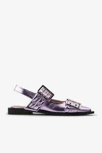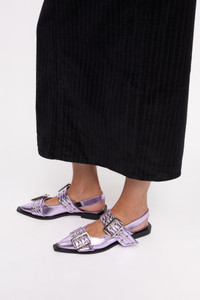 These Pink Metallic Feminine Buckle Ballerinas feature slingback straps and a pointed toe. The shoes have two silver-tone buckles with matching eyelets and a black squared block heel. DETAILS - 40% recycled polyester, 18% recycled polyurethane fibre, 18% polyurethane fibre, 14% others, 10% viscose. Learn more about our materials - The metallic color may change when exposed to sunlight Made in: Portugal Product ID: S2874 SIZE & FIT - Fits true to size, take your normal size