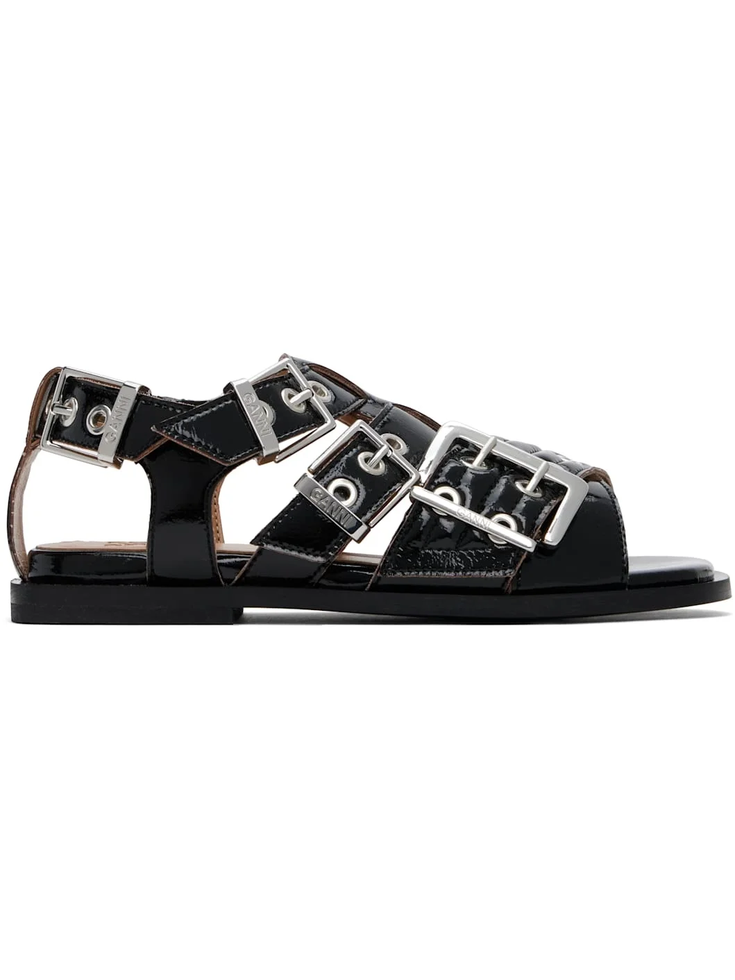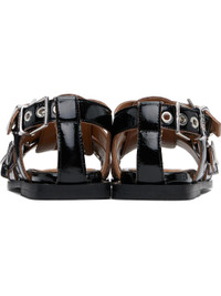 Patent faux-leather flat sandals in black. · Open toe · Pin-buckle crisscrossing straps at vamp · Partially elasticized pin-buckle slingback strap · Logo embossed at padded footbed · Buffed faux-leather lining · Stacked rubber block heel · Faux-leather sole · Logo-engraved silver-tone hardware Supplier color: Black Upper: synthetic. Sole: synthetic, rubber. Made in Portugal 251144F124001