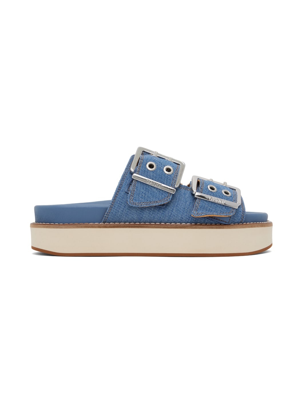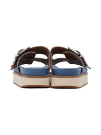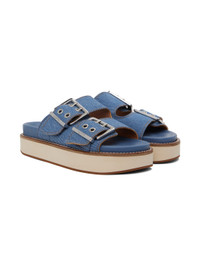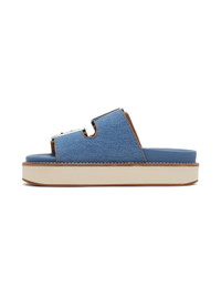 Denim slip-on sandals in blue. · Open round toe · Pin-buckle straps at vamp · Logo embossed at moulded buffed leather footbed · Stitching in white at welt · Foam rubber platform midsole · Rubber outsole · Platform: H1.25 in Supplier color: Denim