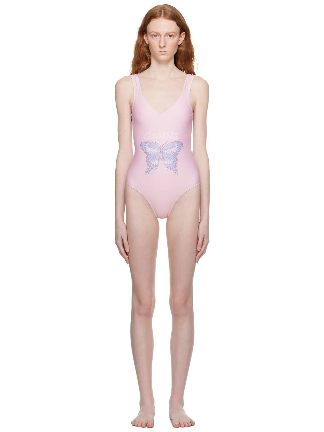 Stretch recycled polyester jersey one-piece swimsuit. · Plunging v-neck · Crystal-cut logo at front · Graphic printed at front · Low back · Fully lined Supplier color: Light lilac Body: 78% recycled polyester, 22% elastane. Lining: 83% recycled polyamide, 17% elastane. Made in Portugal 231144F103000