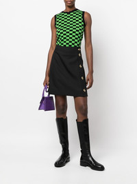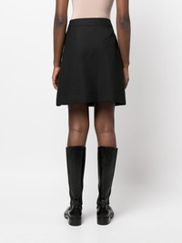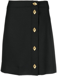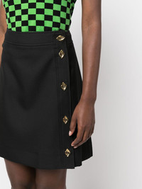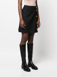 button-up mini skirt button-up mini skirt from GANNI featuring jet black, recycled polyamide blend, side button fastening, high waist, wrap design and tailored cut. POSITIVELY CONSCIOUS: This Planet Conscious product is crafted from certified recycled or upcycled materials, which helps you make a better choice for the environment as they generate less energy, save water and reduce the need for new raw materials. For recycled synthetic clothing products we highly recommend using a microfibre-catching washing bag to ensure that no microplastics that can pollute water are released in the process.. POSITIVELY CONSCIOUS: This brand measures the impact of every item they produce and supplies a Carbon Neutral Certification with each purchase, which measures the environmental impact of production and shows that they've covered the cost of making the carbon footprint neutral.. Imported Composition Recycled Polyamide 70%, Ecovero 30% SIZE & FIT Model measurements Height 5 ft 10 in(1.77 m) Bust/Chest 29.92 in(76 cm) Hips 34.25 in(87 cm) Waist 23.62 in(60 cm) Measurement LENGTH 19.48 in(49.5 cm) WAIST 25.98 in(66 cm) FittingInformation This piece fits true to size. We recommend you get your regular size Designed to be fitted at the waist and hips, loose over the leg Made with a mid-weight non-stretch fabric Washing instructions Hand Wash