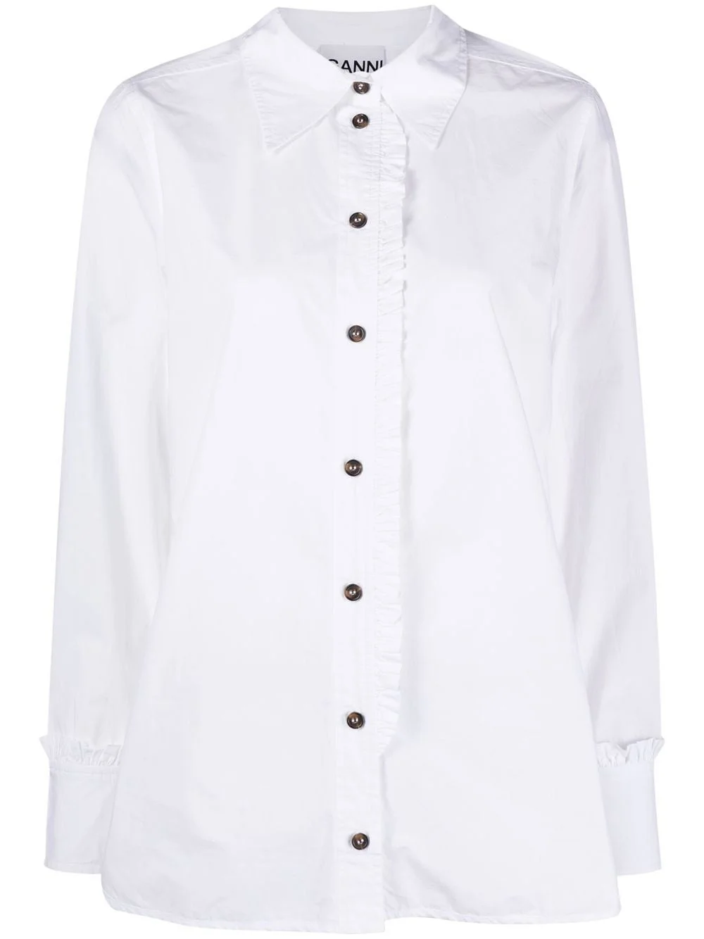 button-up shirt Ganni updates a classic shirt with this long-sleeve design for SS23, thanks to ruffled detailing that runs alongside the button closure and complements the cuffs. Highlights - White - Organic cotton - Frill detailing - Classic collar - Front button fastening - Long sleeves - Buttoned cuffs Imported Composition Organic Cotton 100% Washing instructions Machine Wash