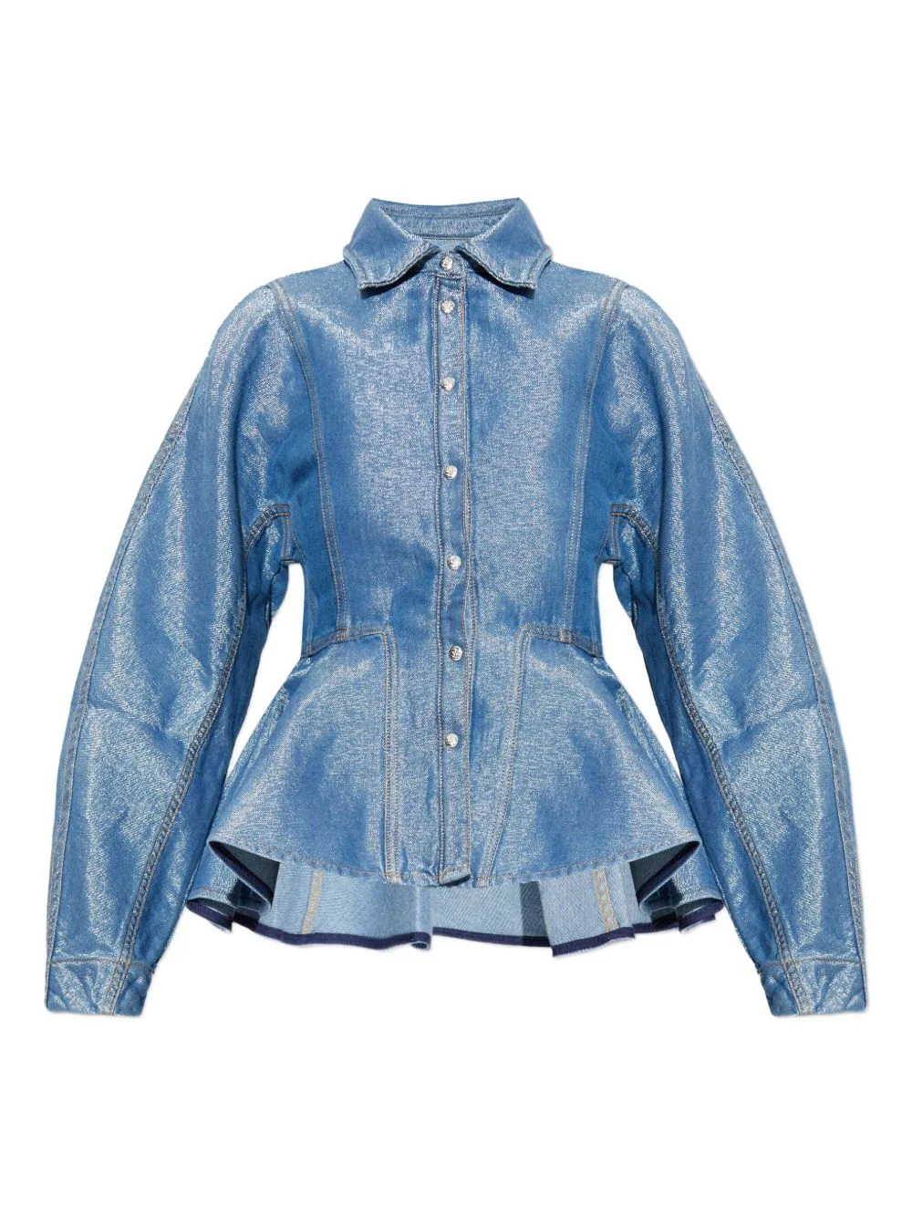 buttonned peplum denim jacket Highlights - Blue - Button fastening - Peplum hem - Long sleeves - Collared - Topstitching Made in Italy Composition Organic Cotton 82%, Polyester 16%, Other Materials 2% Washing instructions Read Manufacturer Guidelines