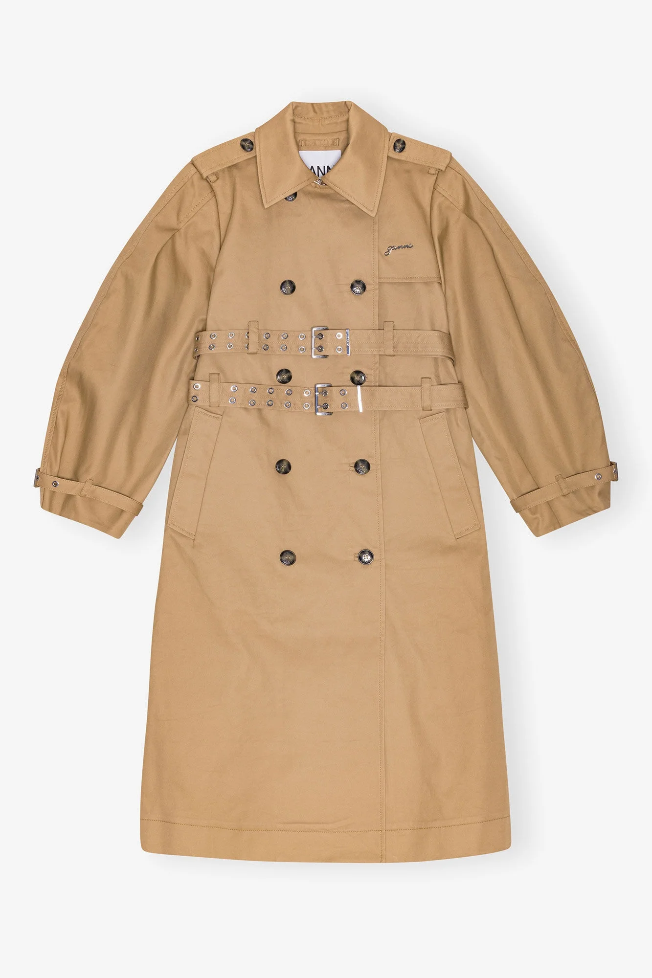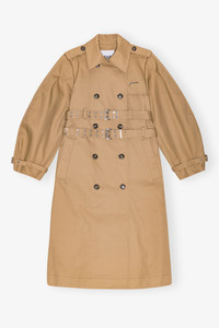 The Camel Bonded Cotton Trench Coat is a timeless wardrobe staple that will see you through every season. Crafted from organic cotton, it features a double-breasted button closure, iconic puff sleeves in a curved design with an adjustable eyelet belt detail, a metallic GANNI logo, and two adjustable, removable belts at the waist. DETAILS - 100% organic cotton. Learn more about our materials - Lining composition: Bonding: 100% Organic Cotton - Curved sleeves - Adjustable cuffs - Double-breasted button closure - Matching belt - Embroidered GANNI logo Made in: China Product ID: W0221 SIZE & FIT - Cara is 5’9” and wears a size US 4