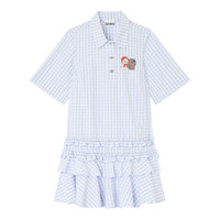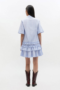 300049240LBL-40 / A5W1109/00/01M - Classic polo collar with button placket - Short sleeves - Embroidered character patch on chest - Drop waist construction - Multi-tiered ruffle hem - Pure cotton gingham check fabric - Relaxed fit through bodice The GANNI Check Cotton Polo Dress delivers contemporary Scandinavian style with playful feminine details. Crafted from pure cotton in classic blue and white gingham check, featuring a structured polo collar and embroidered character patch detail. The drop waist silhouette with tiered ruffle hem creates a modern take on preppy dressing.
