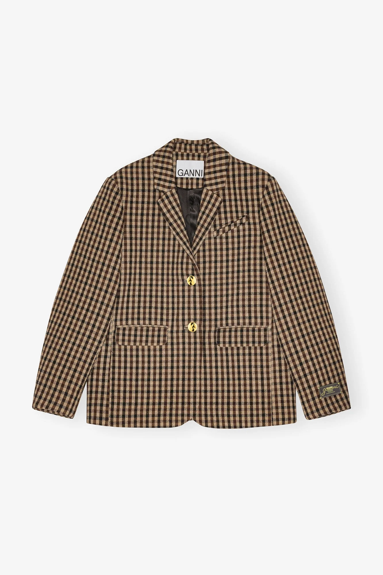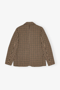 This blazer features a check print, a collar, notched lapels and a 2 button-front closure. The blazer has a GANNI logo patch on the sleeve. DETAILS - 75% recycled polyester, 25% recycled wool. Learn more about our materials - Lining composition: 57% Acetate 43% Viscose - Check print - Collar and notched lapels - Button-front closure - 3 pockets - Gold-tone buttons - GANNI logo patch Made in: China Product ID: W0426 SIZE & FIT - Regular fit - Chen is 5’10” and wears a size US 4 - For personalised guidance on sizing and fit, contact our Customer Service team - here - .